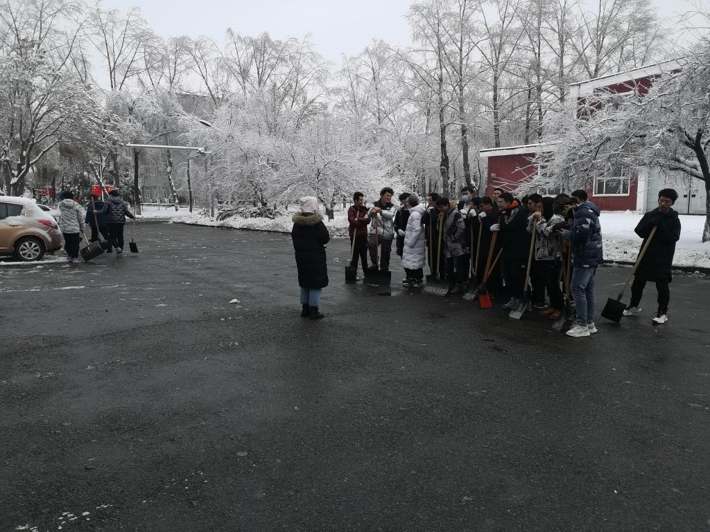 为及时铲除冰雪,消除安全隐患,优化出行环境,11月9日上午,学院全体政工干部对学院楼周围及卫生责任段进行道路积冰积雪清理,百余名学生参与其中,有开展志愿服务的党员,也有参加公益劳动的学生,大家不畏严寒,干劲十足,斗志昂扬,将劳动教育课堂贯穿了到日常生活之中。