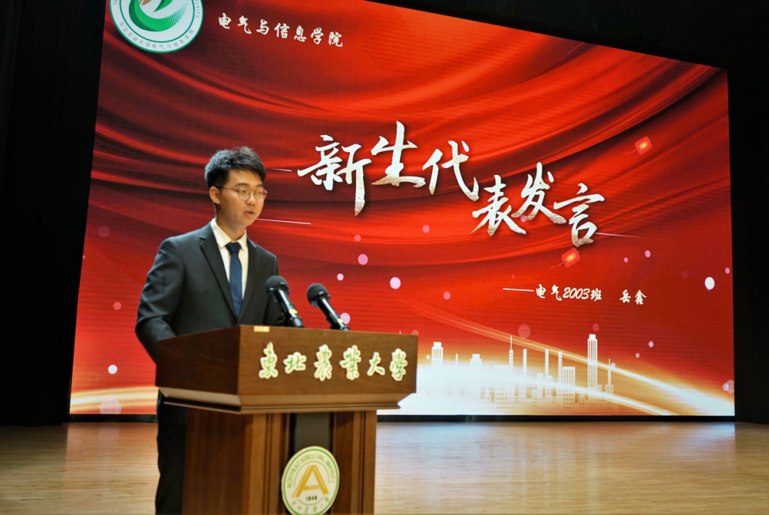 电气2003班岳鑫代表2020级新生发言,分享了入学以来的感悟和收获,表达了作为新生“初生牛犊不怕虎”的决心与气魄。他代表新同学郑重承诺,将严守校规校纪,勤奋刻苦学习,讲究文明礼貌,注重团结协作,做勤学、敬业、德高、技强的新时代东农电信人。展现了新时代东农人脚踏实地、敢于创新、不惧困难、勇攀高峰的良好风貌。