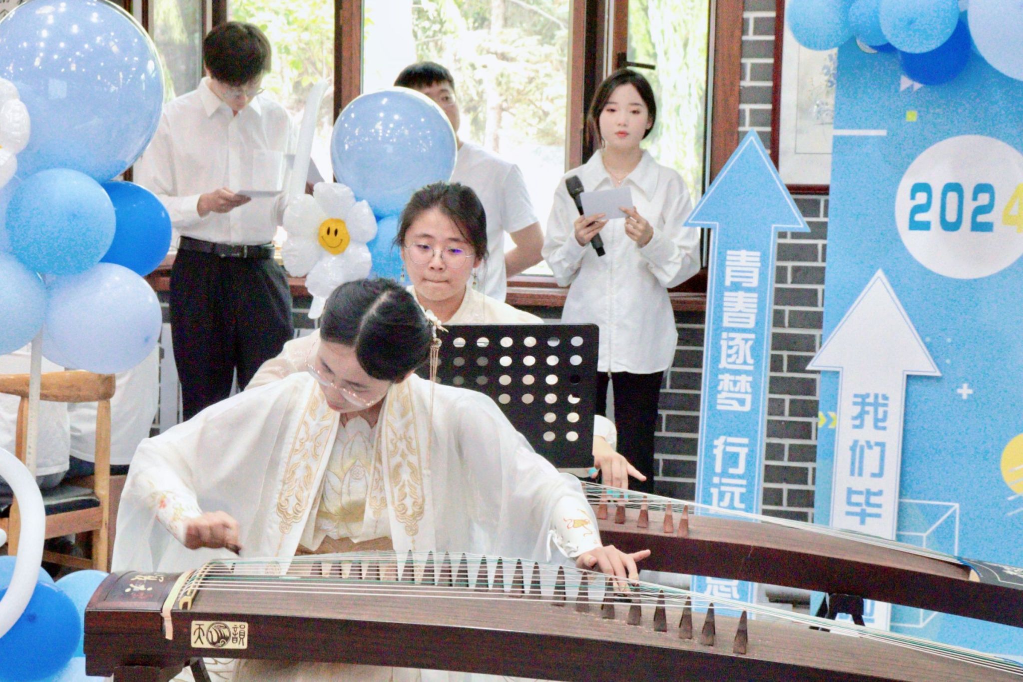 2024届毕业生余宏骏和任宪伟同学合唱歌曲《温柔》,陈俊宇、郭语涵带来古筝重奏《战台风》,刘志炫演唱歌曲《轻轻地告诉你》,张溪蕾与葛佳蕊献唱歌曲《遇见》,李白杨、盛怡玉献唱歌曲《最后一页》,王翰林带来魔术表演,辅导员老师合唱歌曲《栀子花开》,现场掌声连连,精彩不断。
