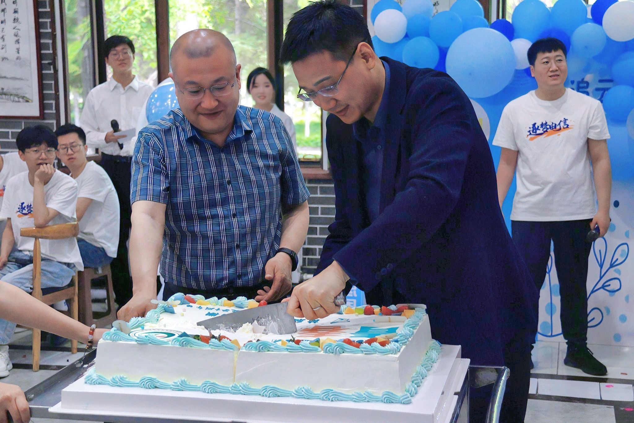 学院为毕业生定制了专属毕业纪念蛋糕,仪式感拉满。学院党委书记万庆生与行政负责人戴百生一同切分蛋糕,以此祝愿同学们一帆风顺,前程似锦。