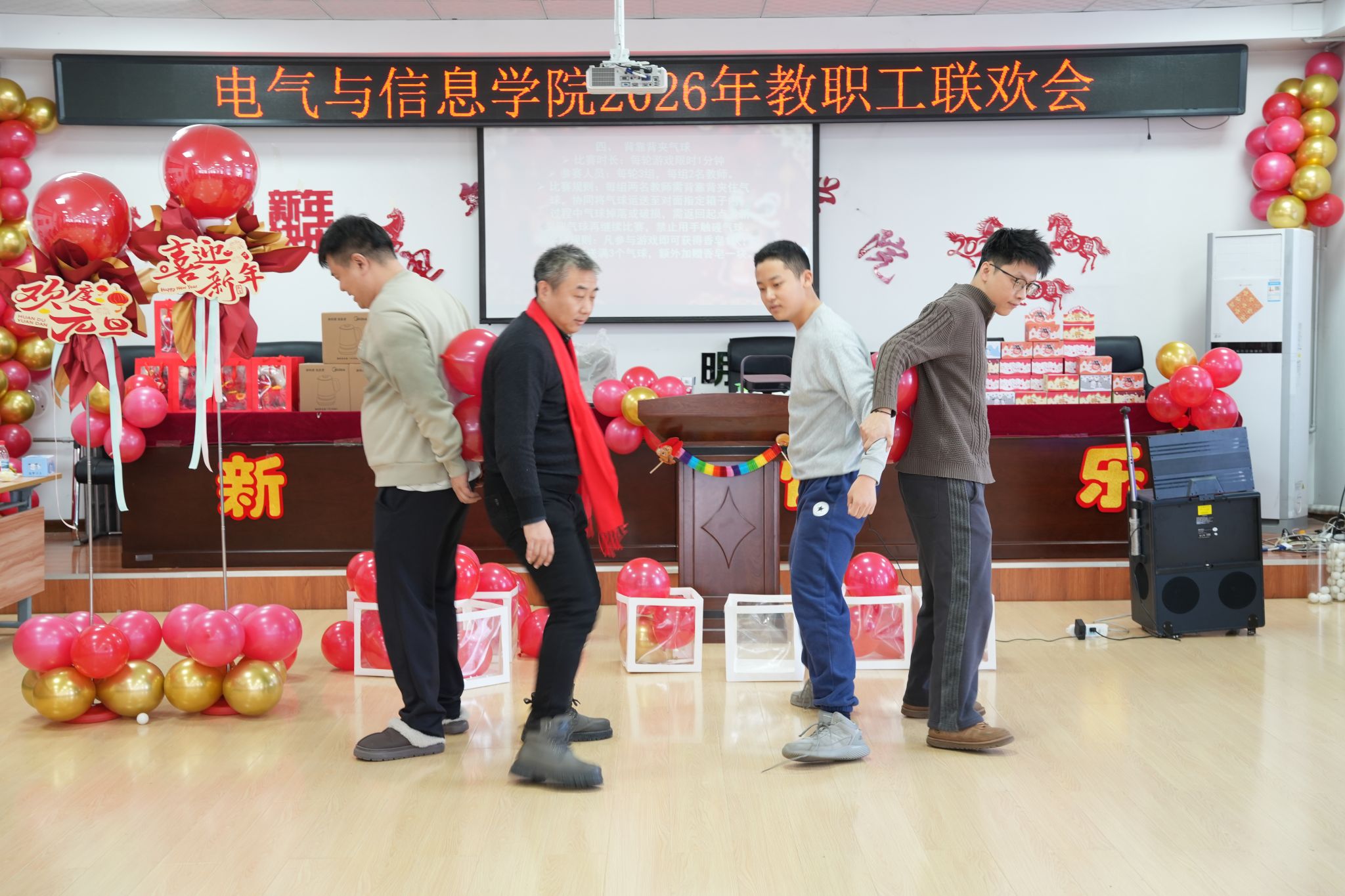 联欢会现场节目精彩纷呈,歌声掌声喝彩声,声声悦耳,台上台下热情互动,全场沉浸在欢乐与感动之中。趣味游戏环节同样亮点十足,杯子投球、你比我猜、抓袋子、背靠背夹气球等游戏轮番上演,老师们踊跃参与、默契配合,欢声笑语不断。