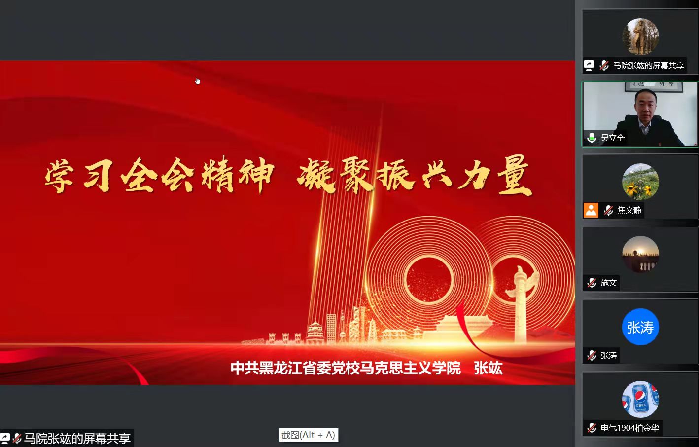 为全面深入学习领会党的十九届六中全会精神,扎实推进学习宣传贯彻工作,持续推动全会精神入脑入心,引导党员干部和师生把思想和行动统一到全会精神上来,落实立德树人根本任务,12月9日上午,bevictor伟德国际1946党委和机关党委教务处党支部共同举办党的十九届六中全会精神专题宣讲报告会。会议邀请中共黑龙江省委党校马克思主义学院副院长、团省委讲师团成员张竑教授作宣讲报告。bevictor伟德国际1946、教务处全体教职工和学生党员参加会议。会议由bevictor伟德国际1946党委书记吴立全主持。