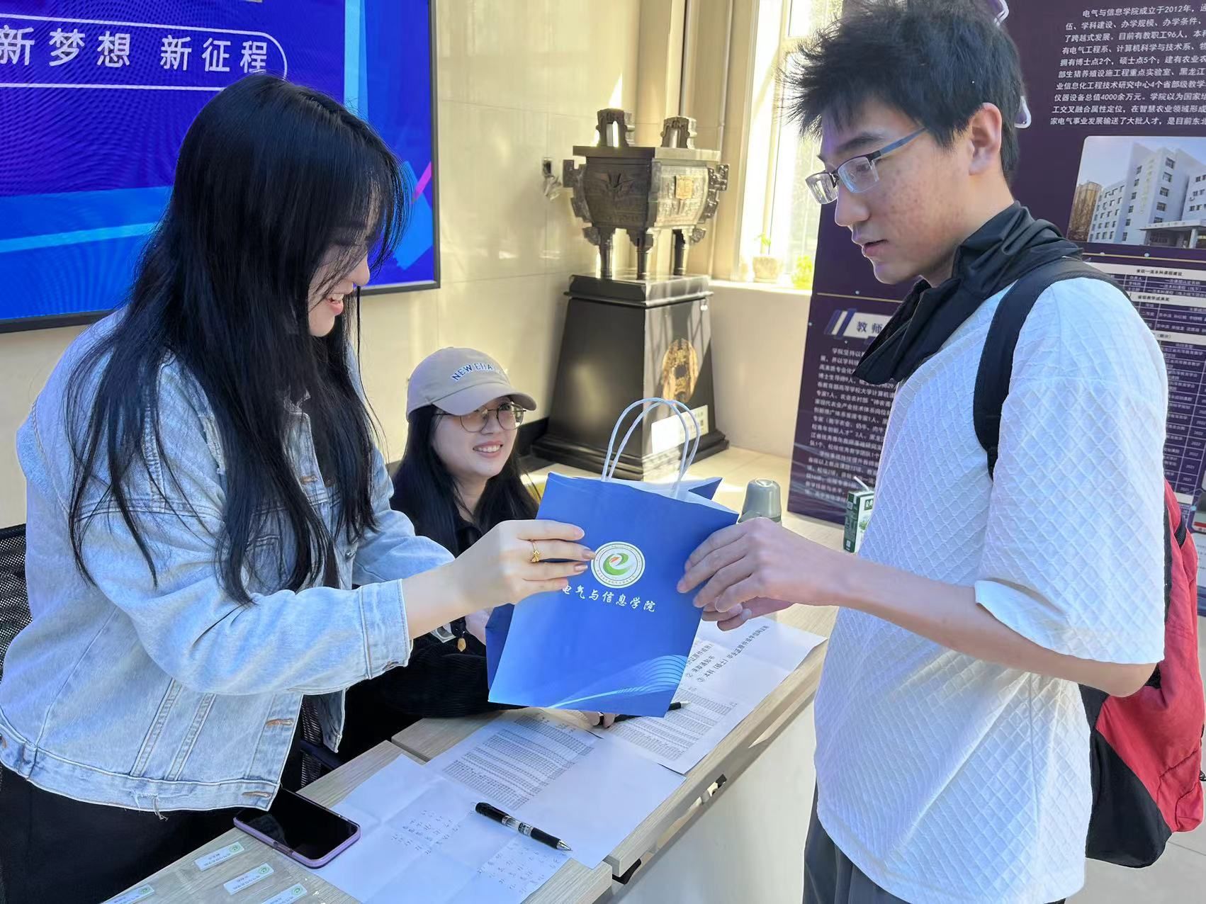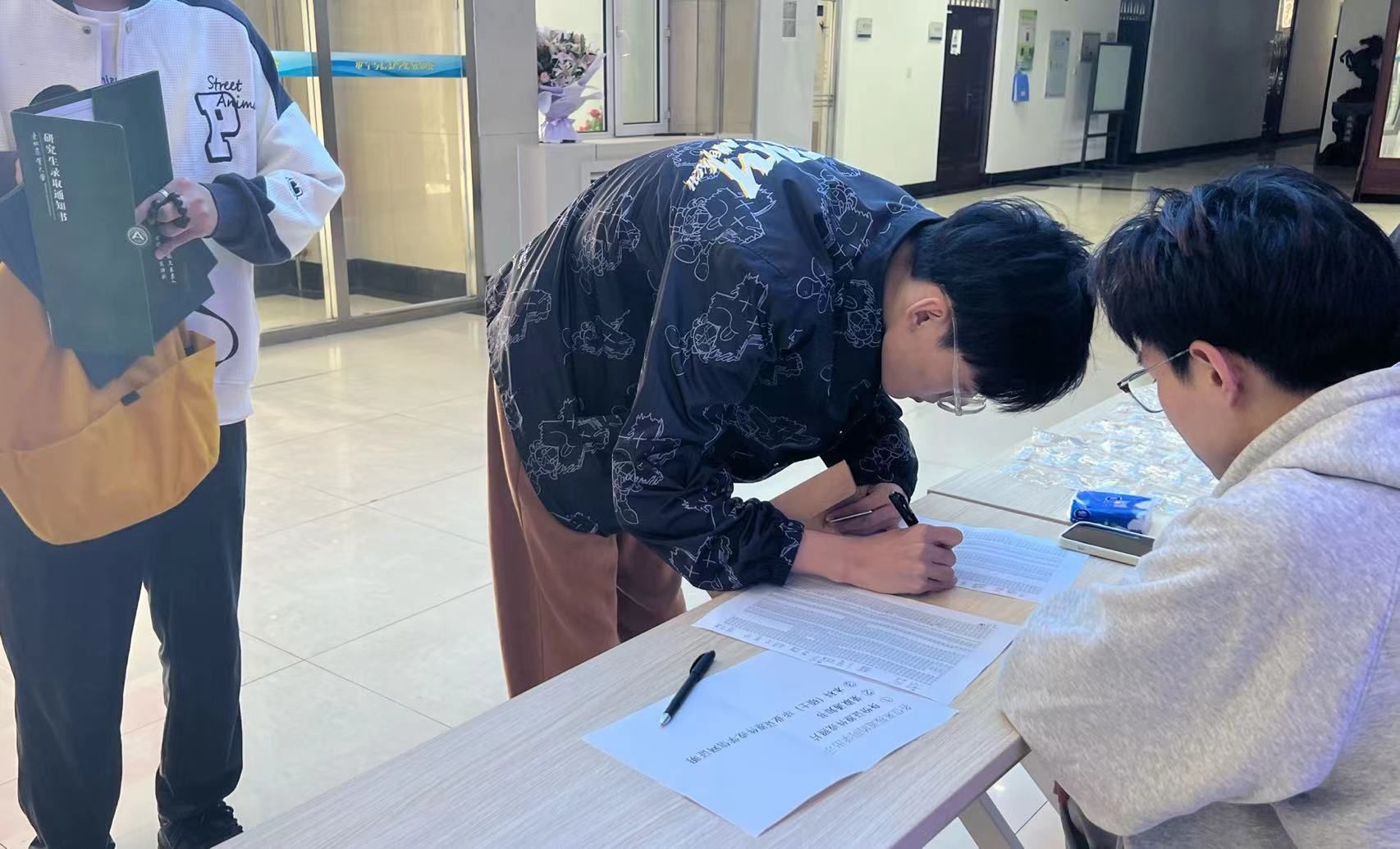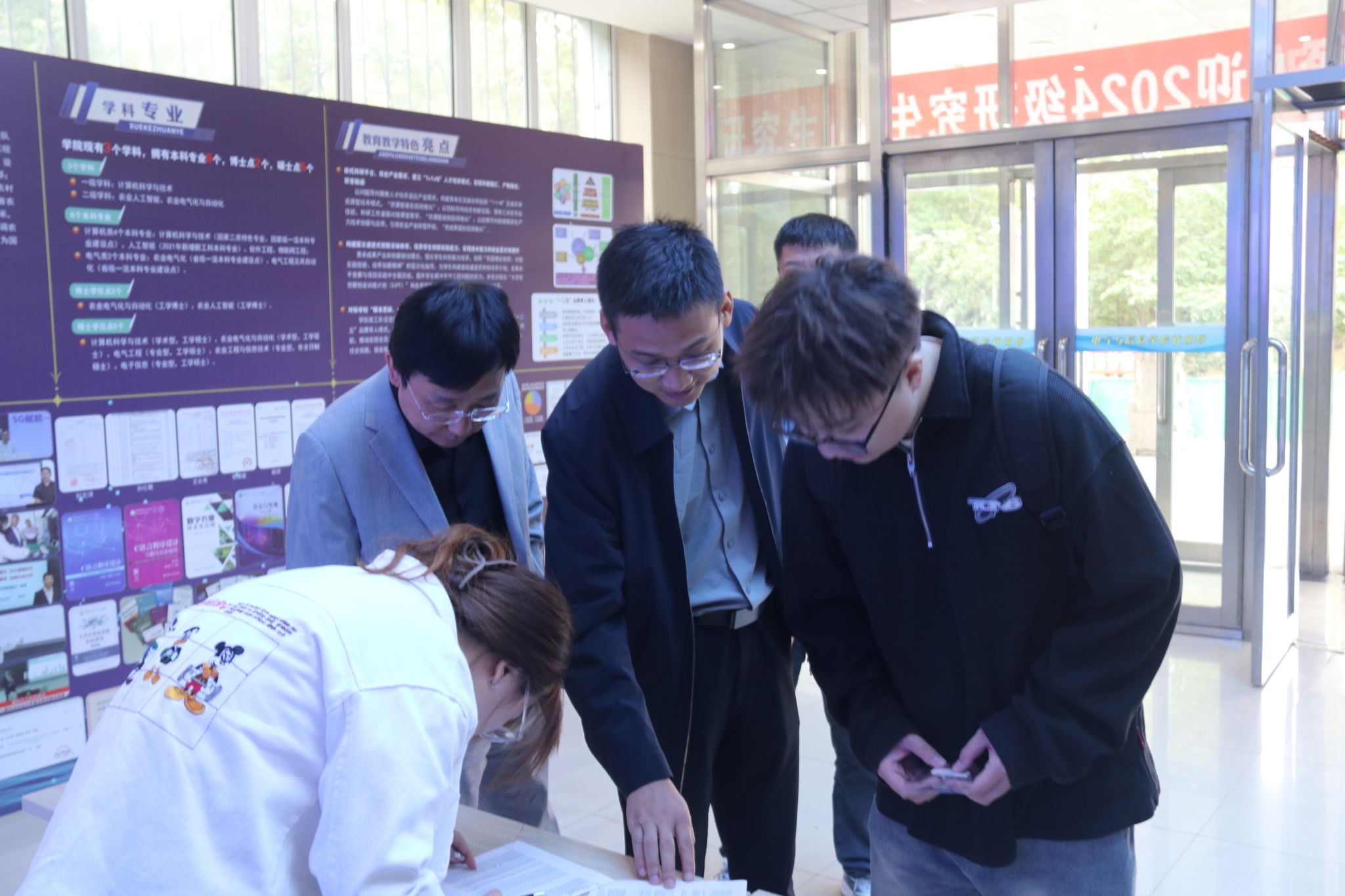 迎新现场,新同学们井然有序,步履轻松,按照事先通知的报到程序,准备证件,并纷纷在现场拍照留念。电信楼前的研究生学生组织介绍和2024届毕业生就业去向统计宣传版,吸引了新同学们驻足观看,激起了大家对研究生生活的向往。
