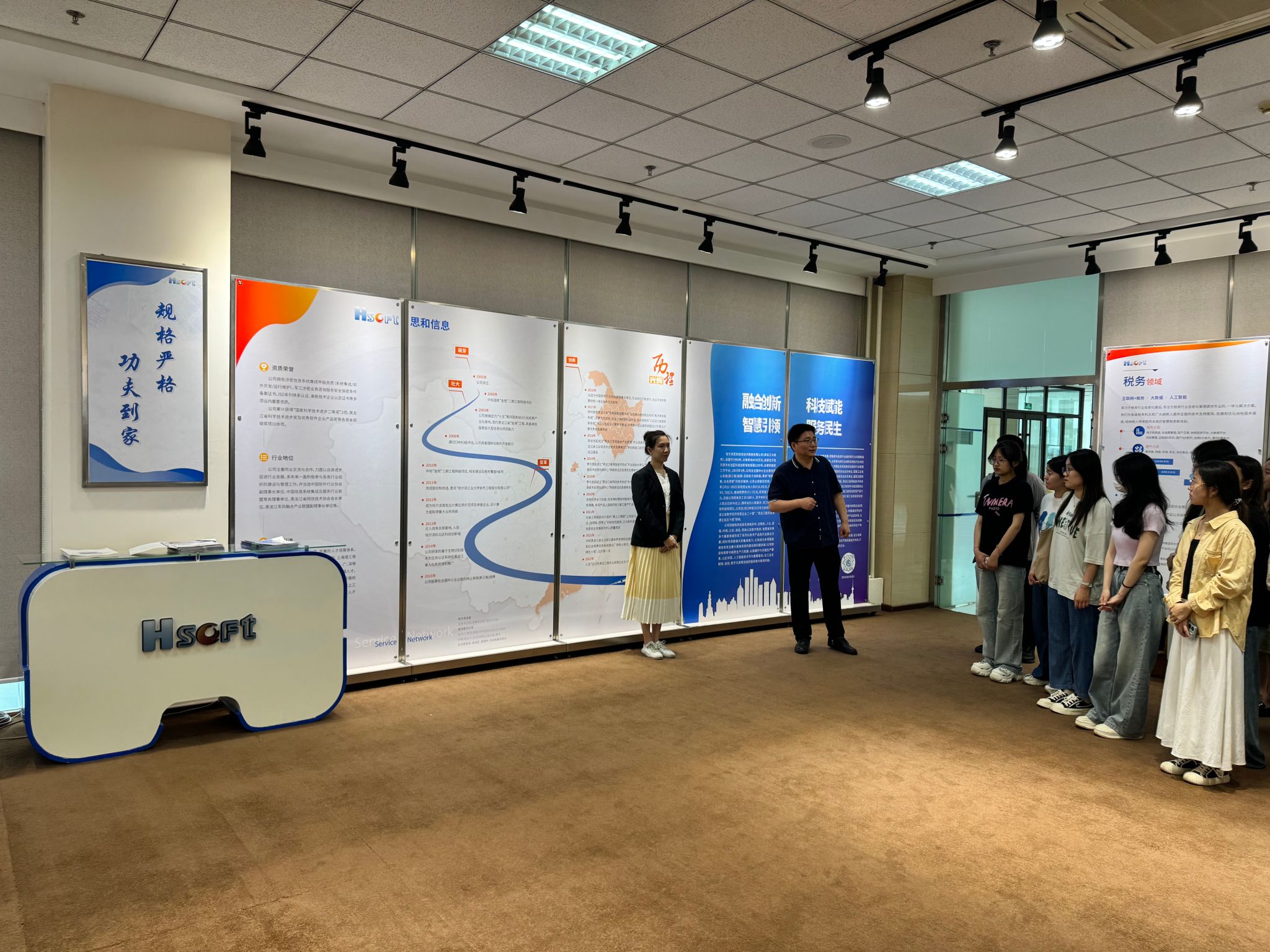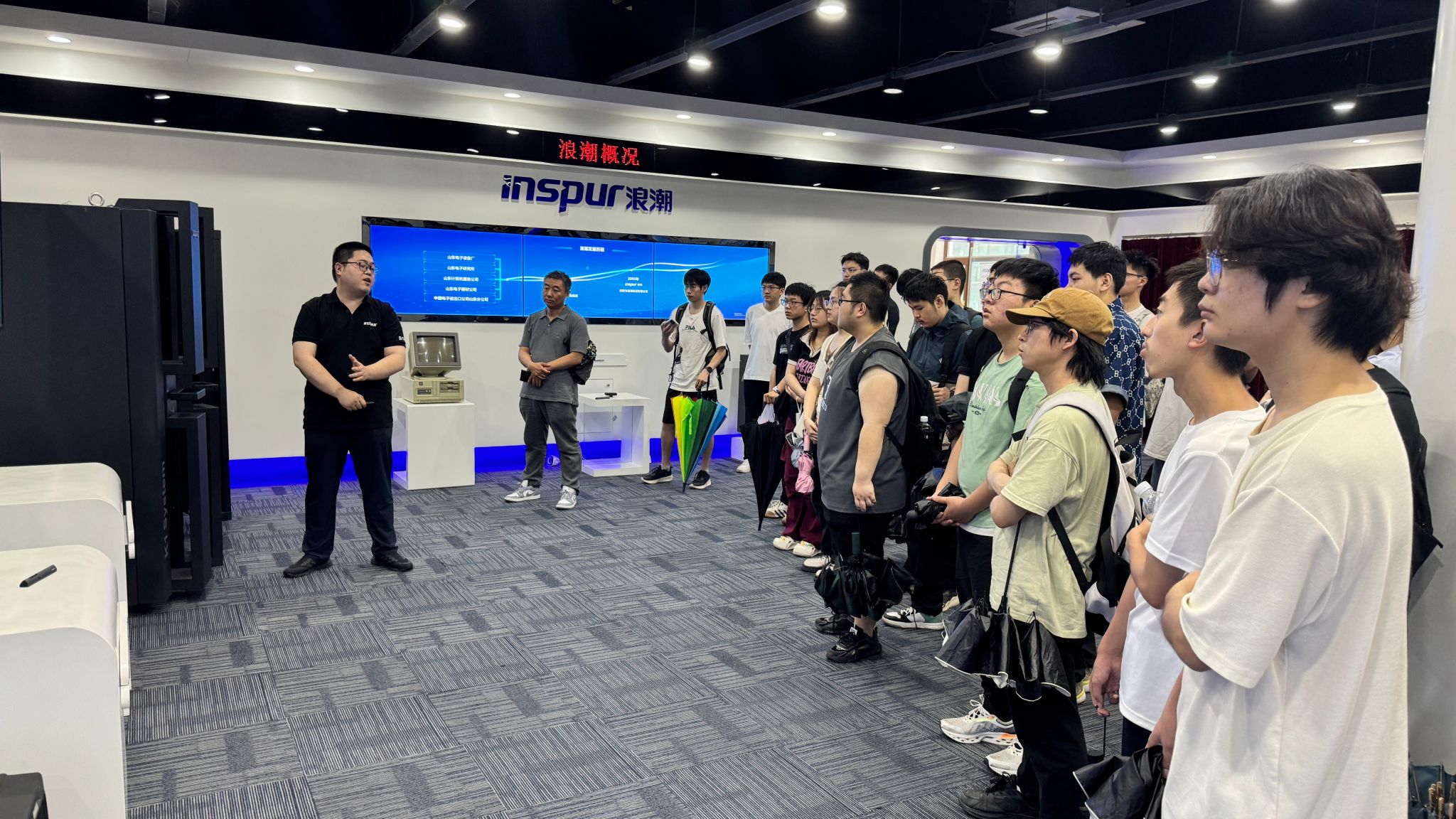 在浪潮软件集团有限公司哈尔滨分公司展厅,工作人员介绍了浪潮公司从硬件到软件领域的成就,同学们不仅被浪潮公司从最初的基础硬件制造到如今高端服务器、云计算、大数据、人工智能等全领域软件解决方案的跨越式发展深深震撼,更对服务器技术日新月异的速度感到由衷的惊叹,更加坚定了自己投身科技创新、服务国家发展战略的决心与信念。