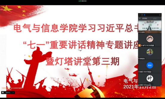 为深入学习贯彻习近平总书记在庆祝中国共产党成立100周年大会上的重要讲话精神,进一步教育引导广大师生党员深刻领会把握讲话的重大意义、丰富内涵和核心思想,11月2日晚,bevictor伟德国际1946举办学习习近平总书记“七一”重要讲话精神专题讲座暨灯塔讲堂第三期,会议邀请学校党史学习教育宣讲团成员、马克思主义学院专职思政课教师韩大猛作专题宣讲,讲座以腾讯会议形式线上召开,学院全体师生党员参会,会议由学院党务秘书、学工办主任焦文静主持。