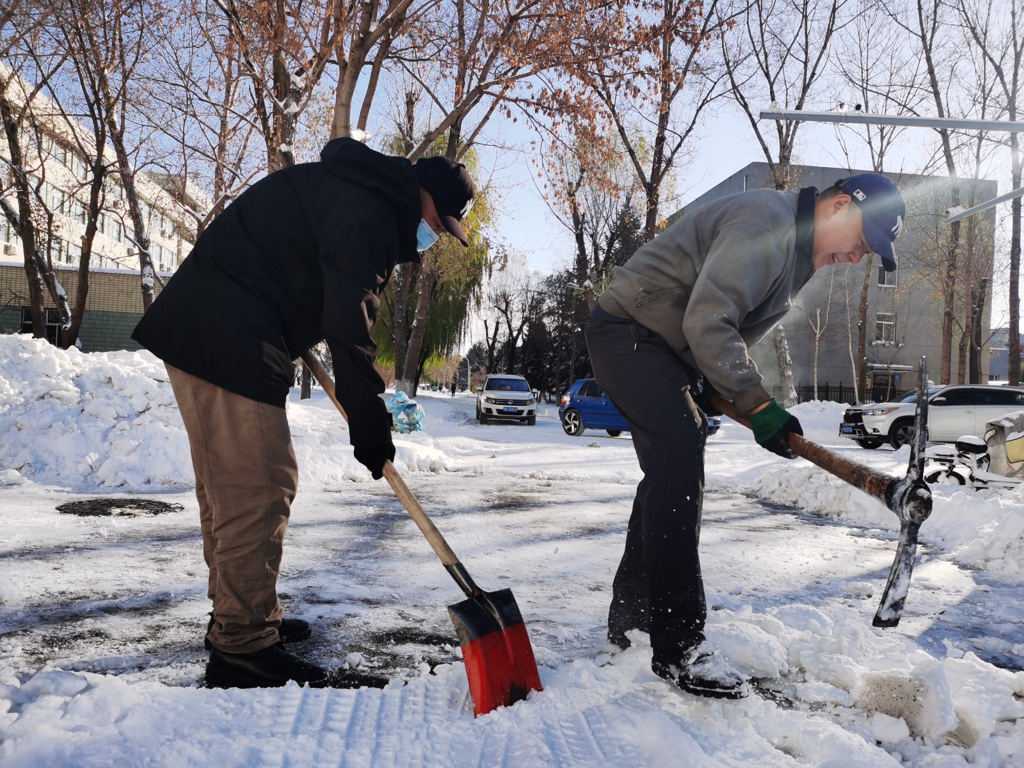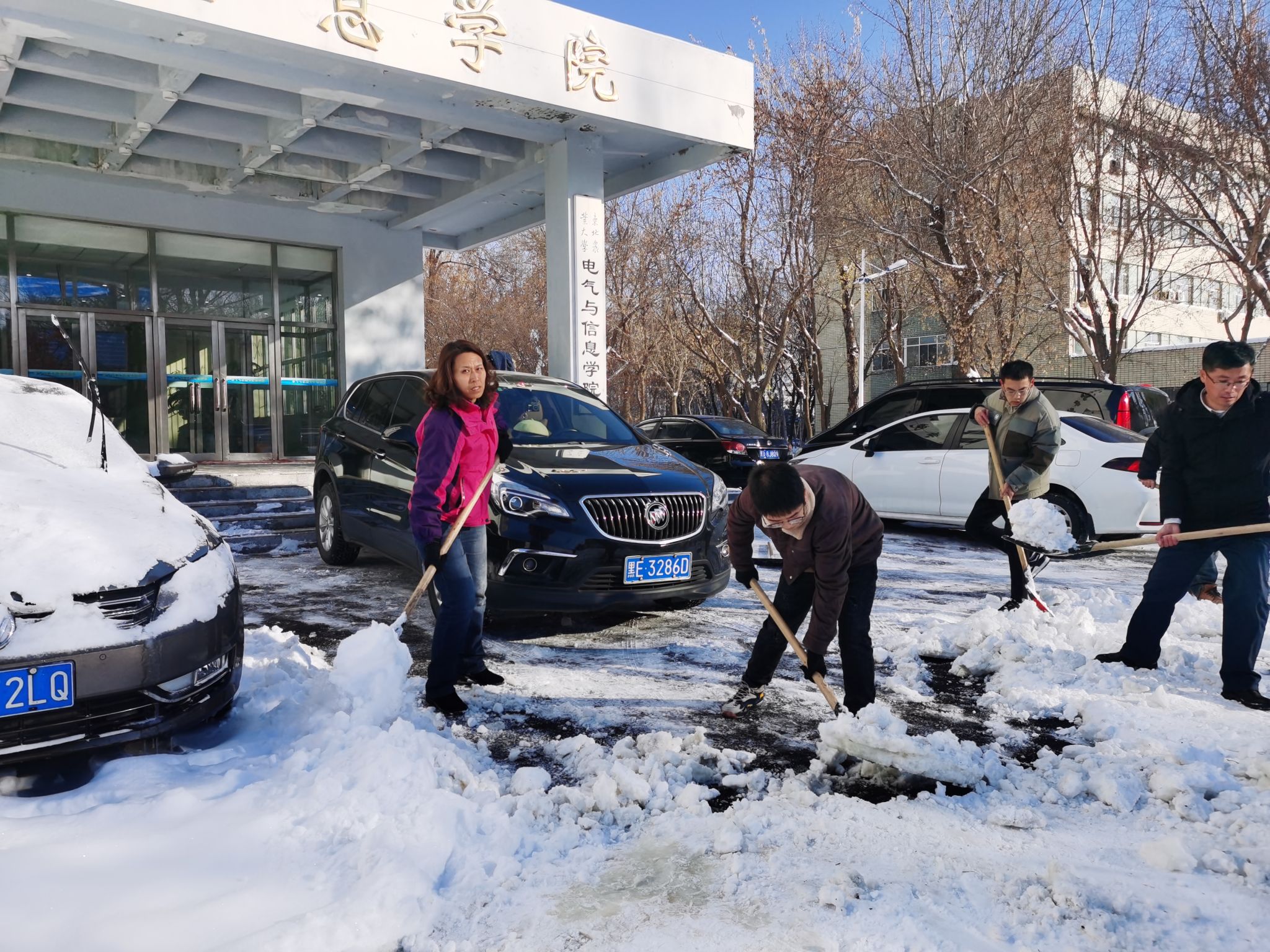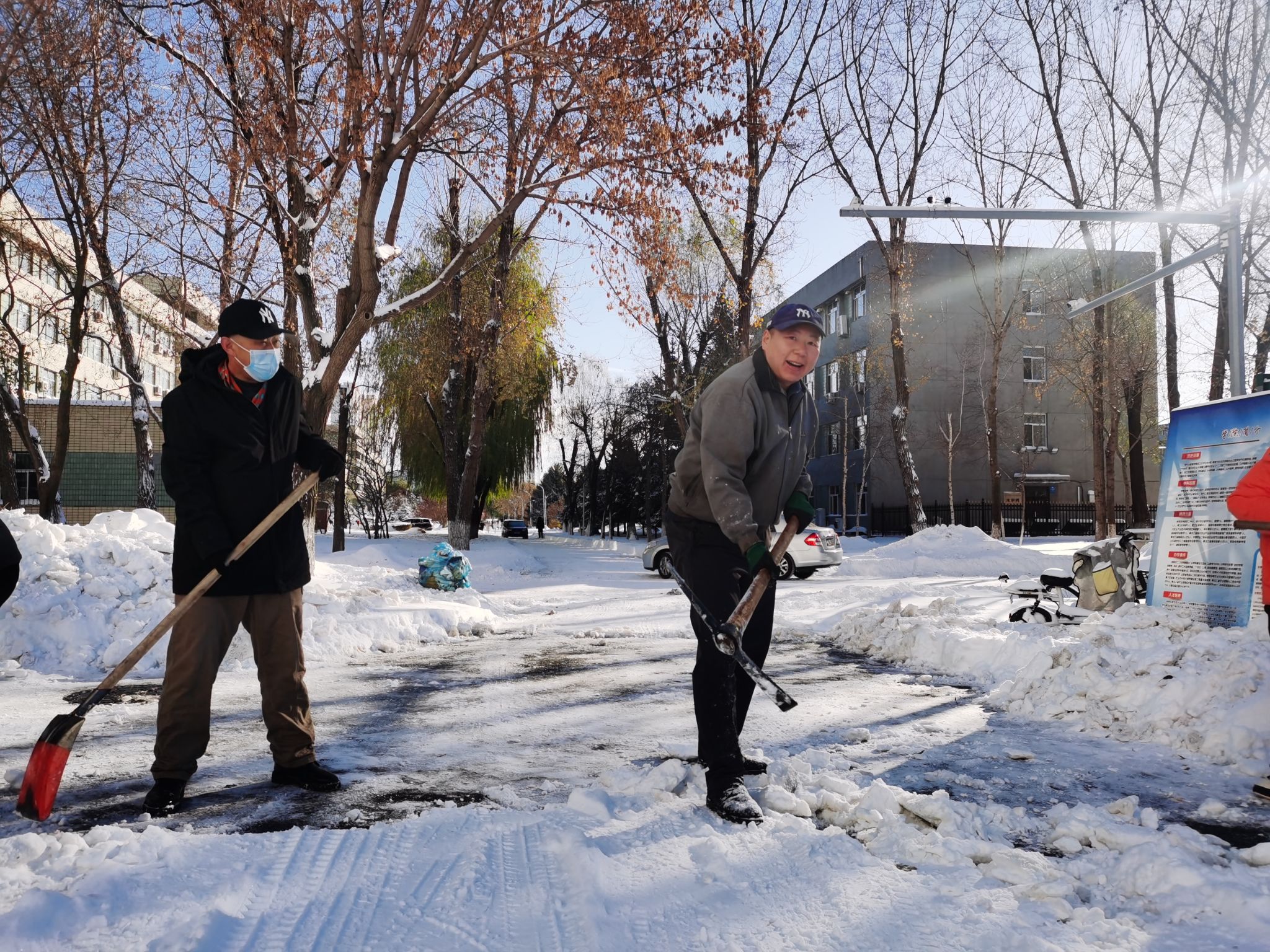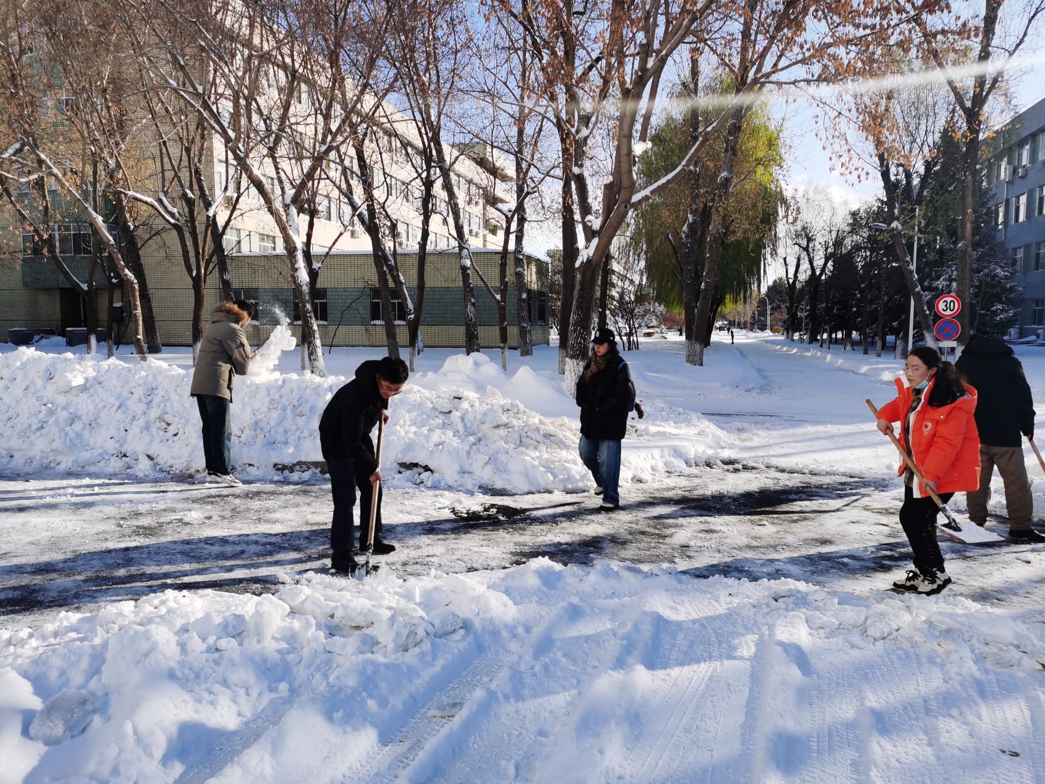 早上8点多,电信楼前东侧广场已经清理出来,后续清扫工作则交给学生劳动班级,以劳动教育课的形式继续完成。在大家清雪过程中,“有心”的摄影师记录下来大家靓丽的笑容和美丽的背影。