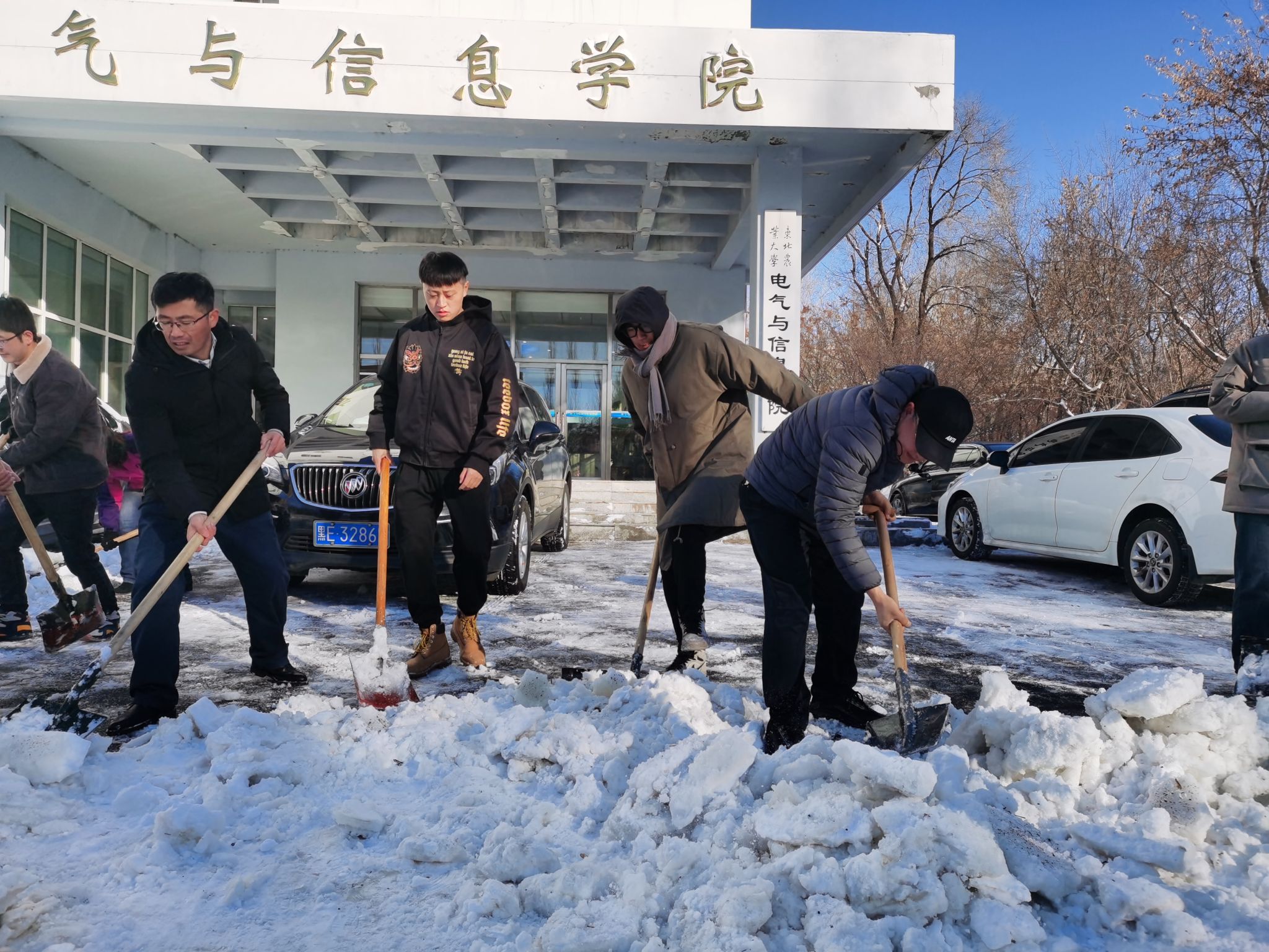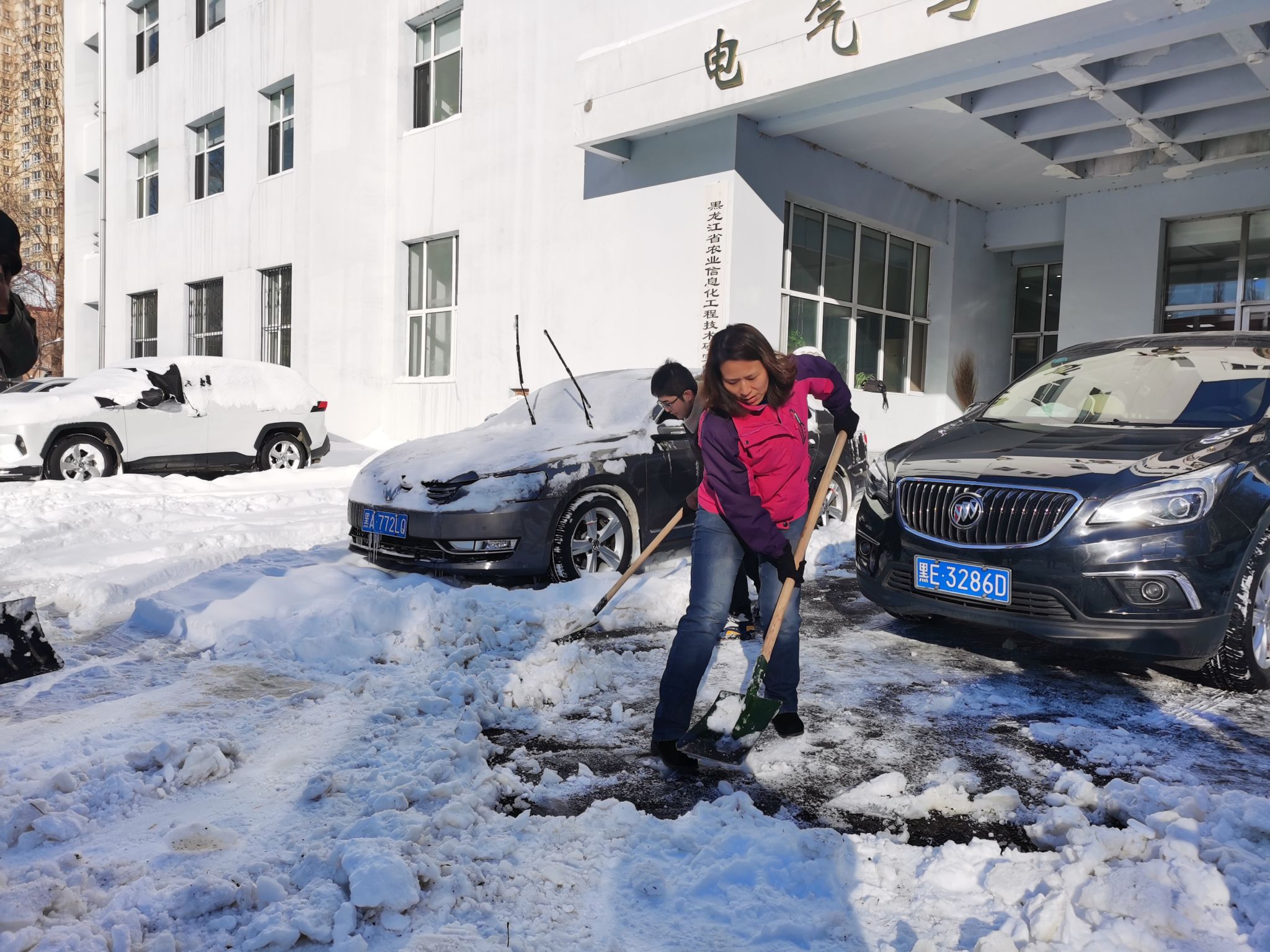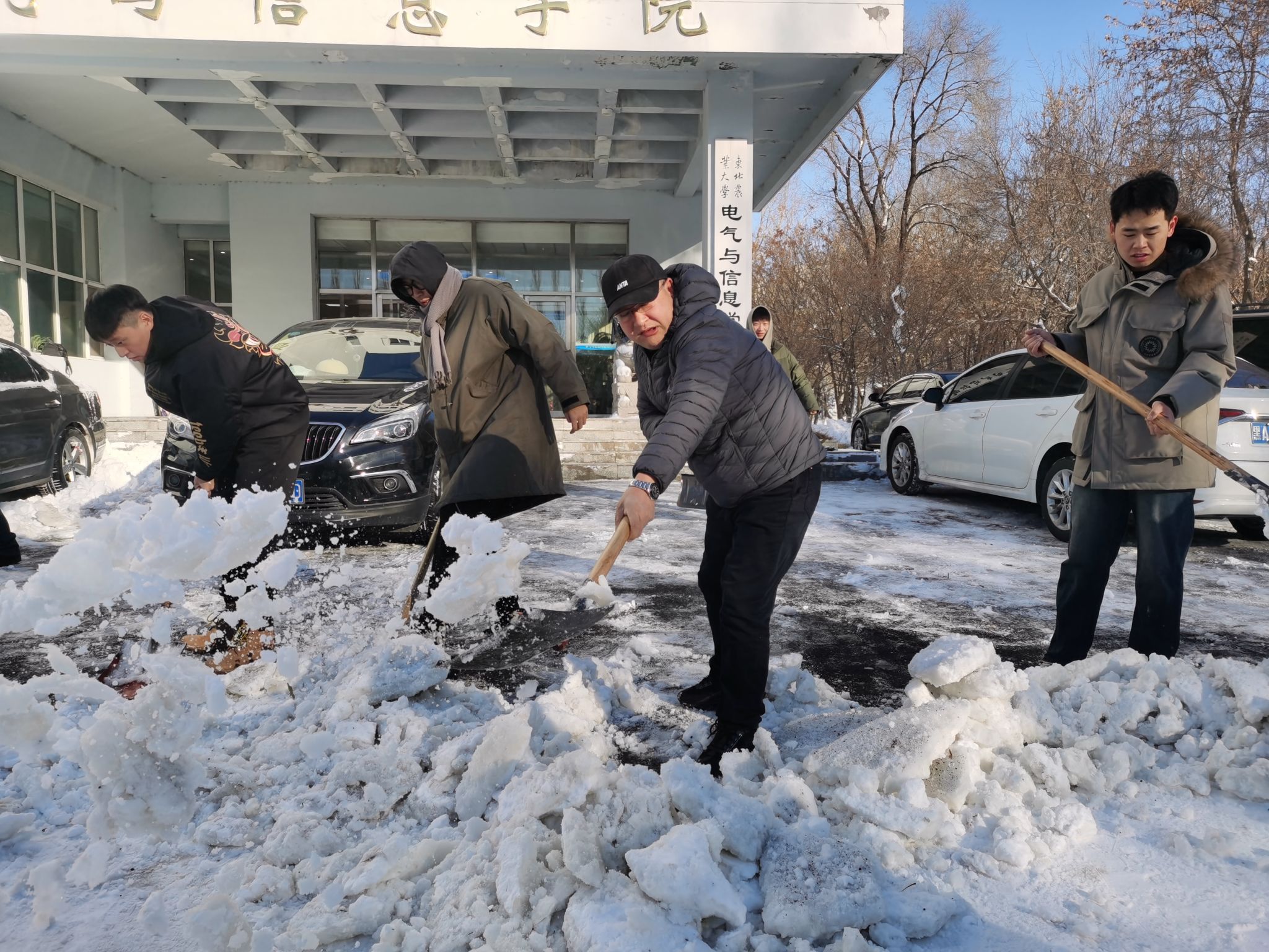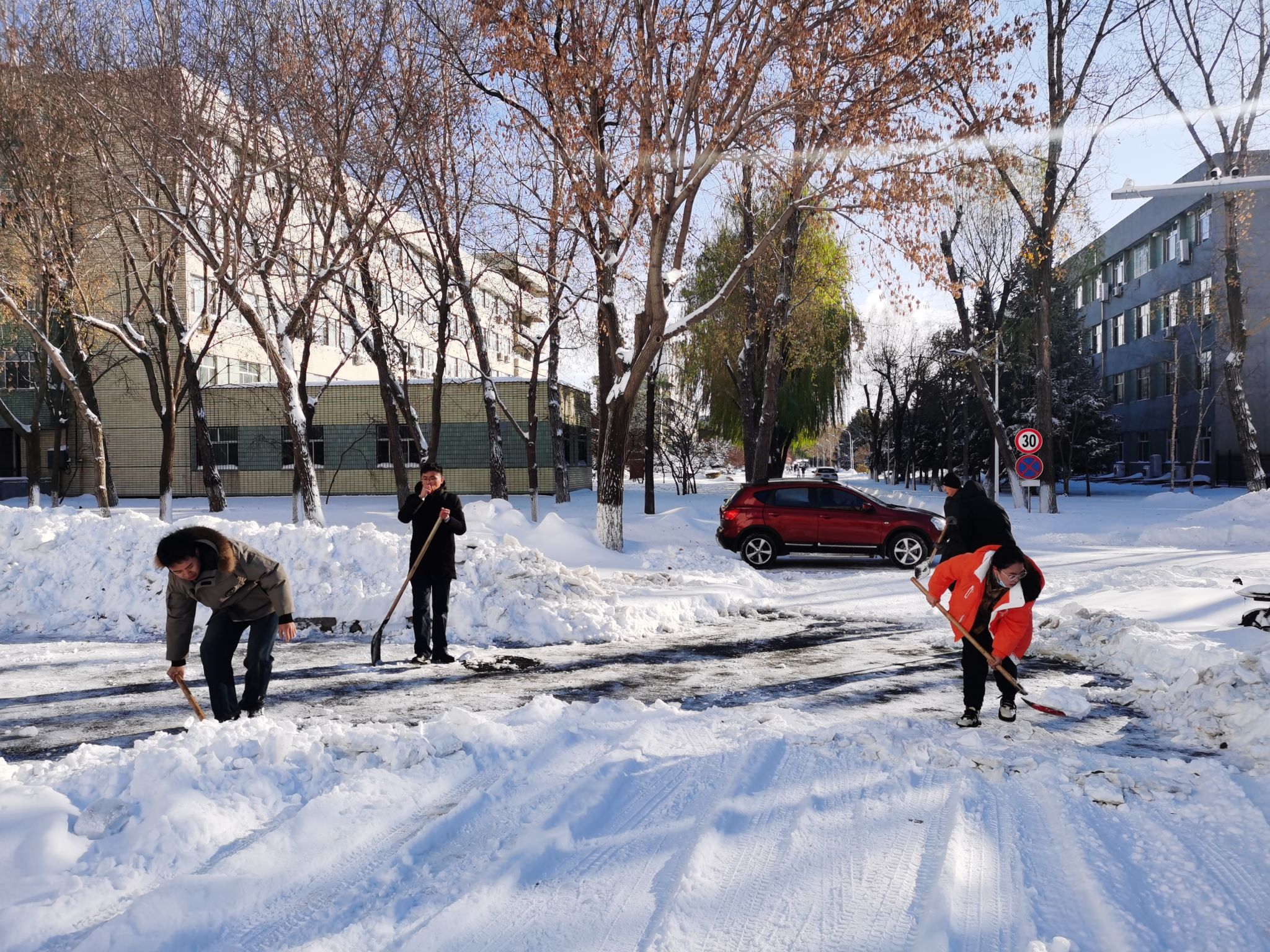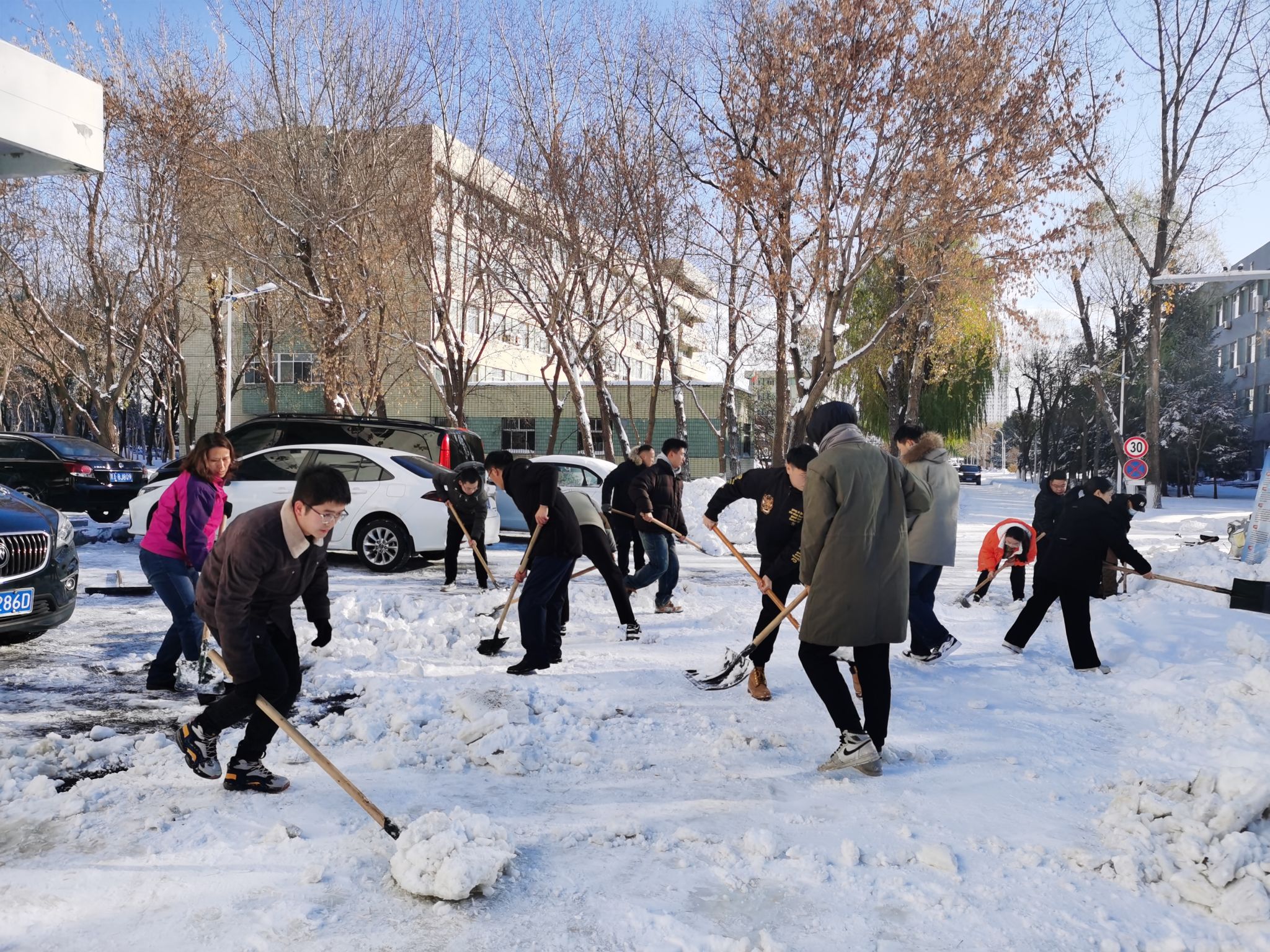 早上8点多,电信楼前东侧广场已经清理出来,后续清扫工作则交给学生劳动班级,以劳动教育课的形式继续完成。在大家清雪过程中,“有心”的摄影师记录下来大家靓丽的笑容和美丽的背影。