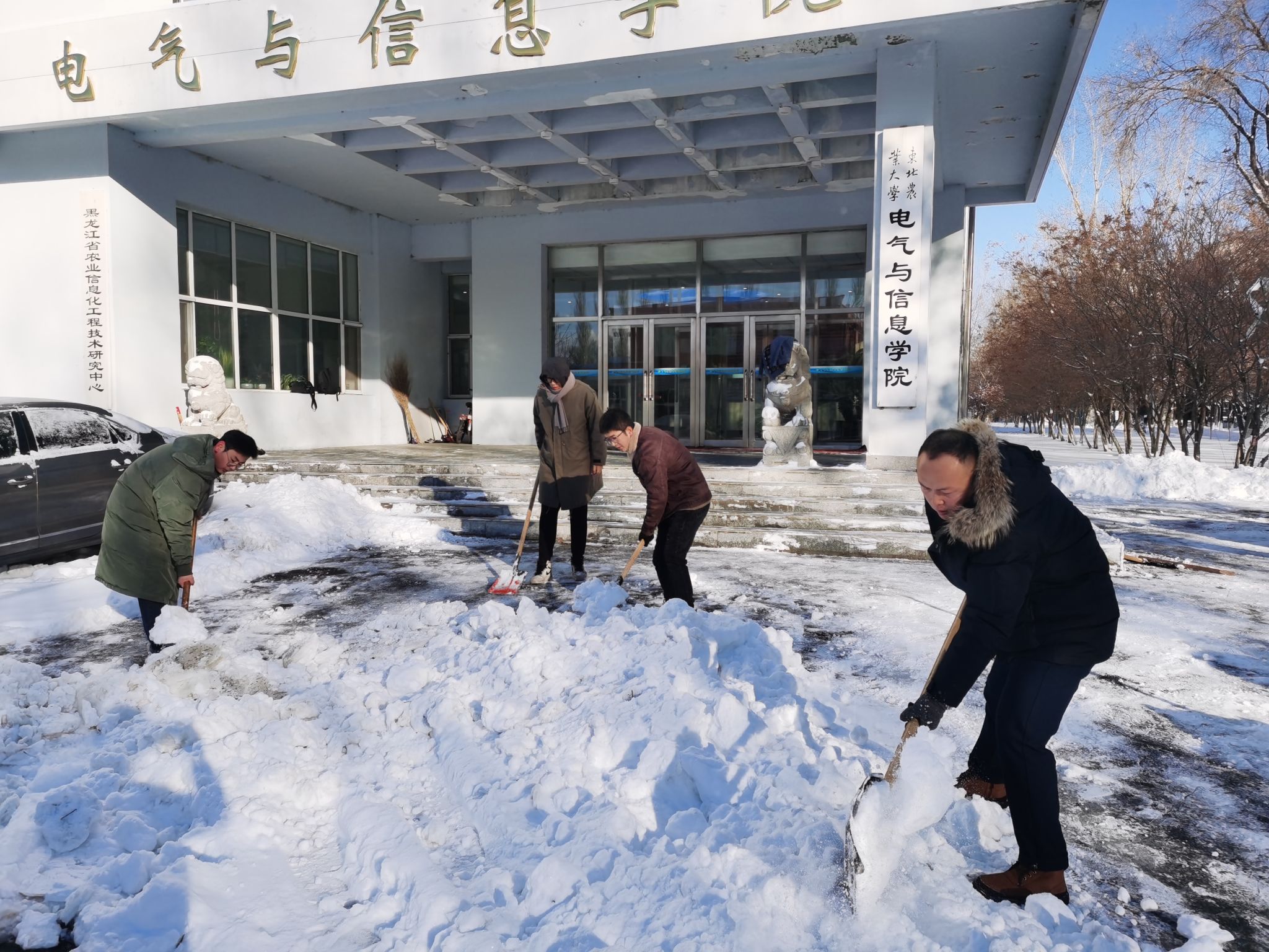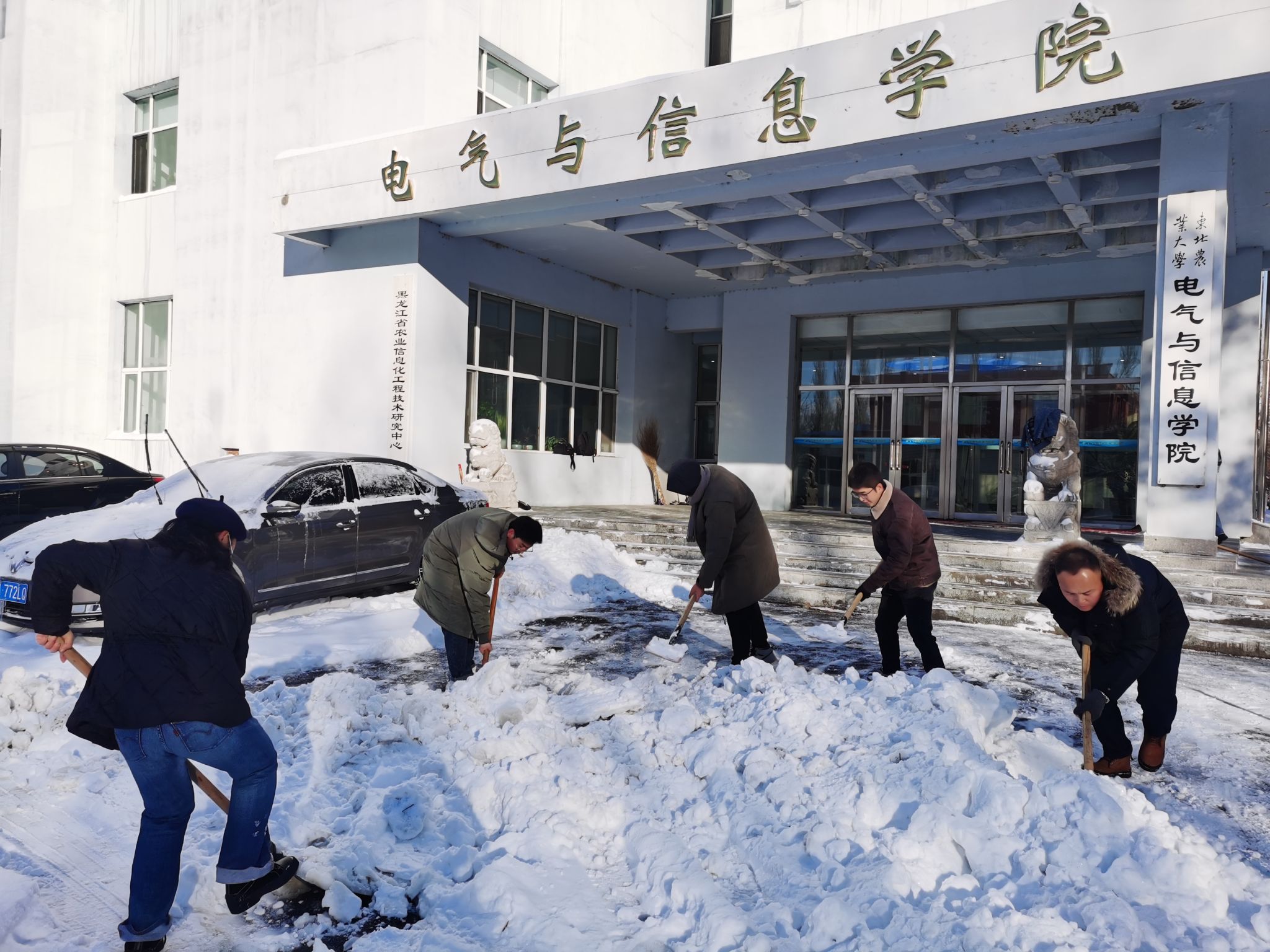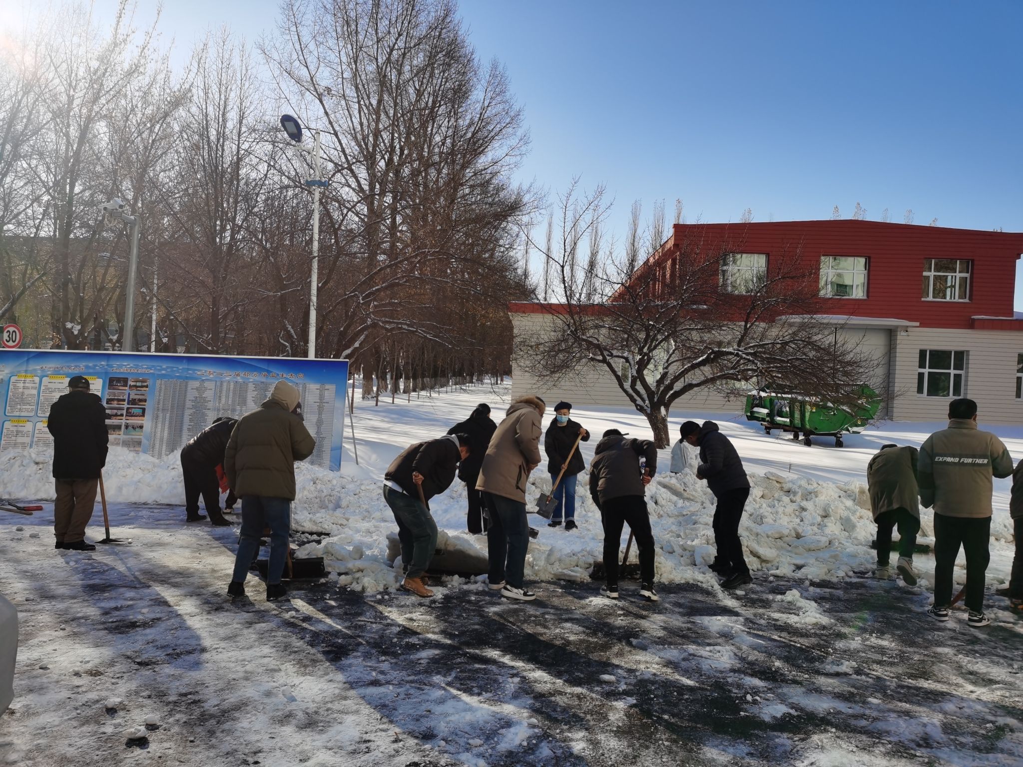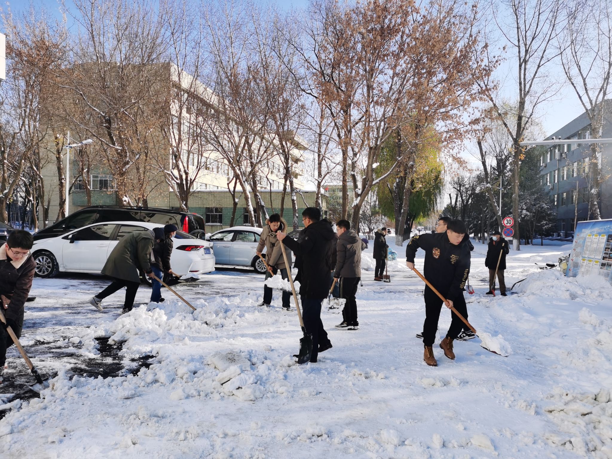 早上8点多,电信楼前东侧广场已经清理出来,后续清扫工作则交给学生劳动班级,以劳动教育课的形式继续完成。在大家清雪过程中,“有心”的摄影师记录下来大家靓丽的笑容和美丽的背影。