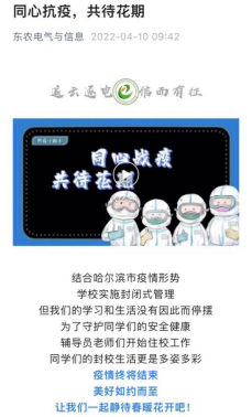 同心战疫,静待花开。自疫情发生以来,学院建立了由100名学生党员、骨干组成的疫情防控志愿服务队,在组织核酸检测、流调信息排查、居寝健康监测等工作中逆行而上、勇于担当,52名学生志愿者参与到办公楼登记测温和食堂秩序维护工作中,形成了一抹亮丽的“志愿红”,用实际行动彰显了新时代青年的蓬勃力量。在校园全封闭管理期间,学院党委书记带领5名辅导员驻校办公,党委副书记与2名辅导员居家“互动”,24小时全天候工作,“重启”了校园生活,与学生同吃同住在一起,成为了学生的“定心丸”“主心骨”。在校院两级党委的正确领导下,在学生工作部(处)的周密部署下,全体电信学工人面对疫情的考验,精心谋划,暖心陪伴,用心守护,与学生同心同行,为取得疫情防控的最终胜利奉献全部的智慧和力量!