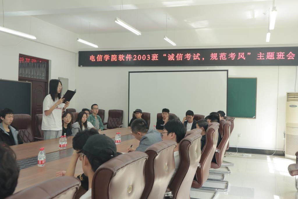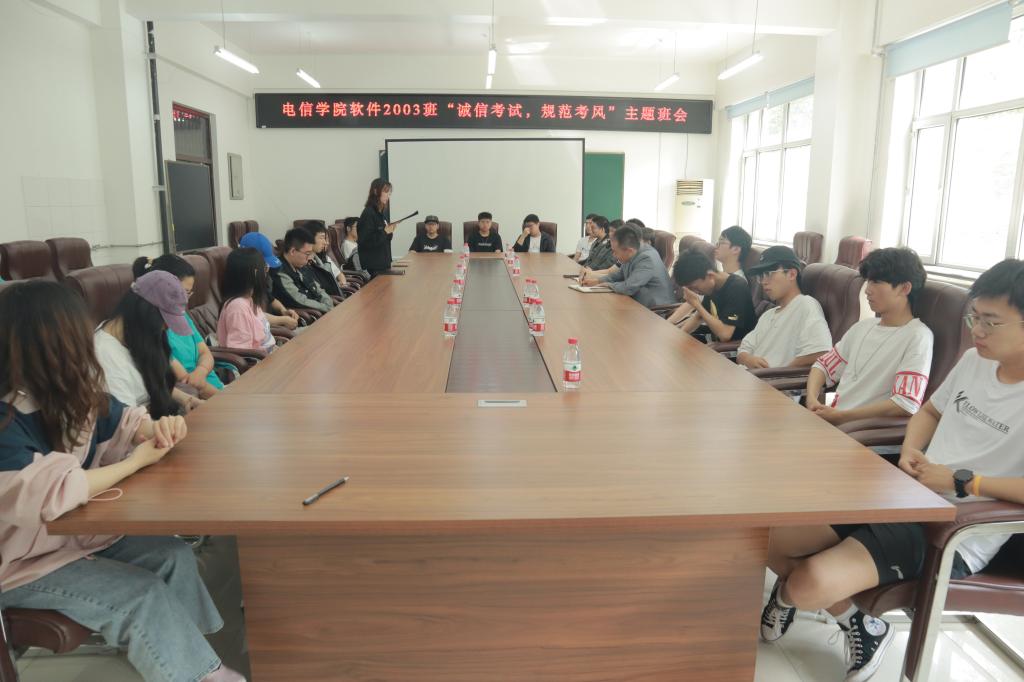 为加强学院学风建设,严肃考风考纪,提高教学质量,软件2003班于6月21日早九点在bevictor伟德国际1946219会议室召开“诚信考试,规范考风”主题班会。学院党委书记吴立全,辅导员老师陈德宝出席班会,软件2003班全体同学参加了本次班会,班会由软件2003班班长魏立栋同学主持。