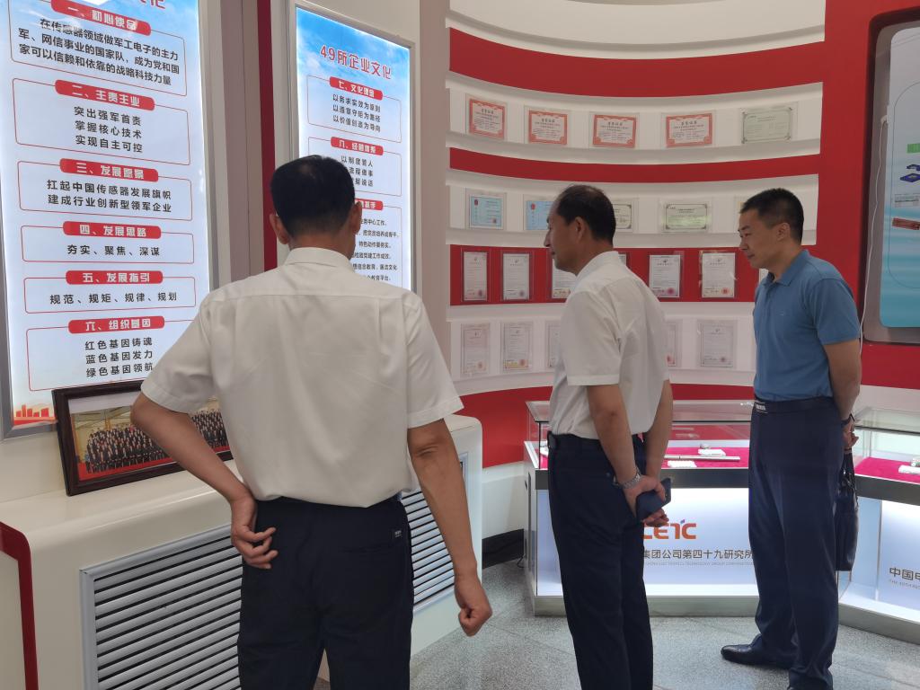 李伟凯一行参观了四十九所传感器与微系统工艺技术中心、企业文化墙、HTCC工艺技术平台,观看了企业宣传片以及敏感元件和传感器研制过程。通过刘成利的讲解,调研人员进一步了解了四十九所工作所涉及领域、发展历程以及为载人航天等国防重点工程研制配套高端特种传感器的情况。