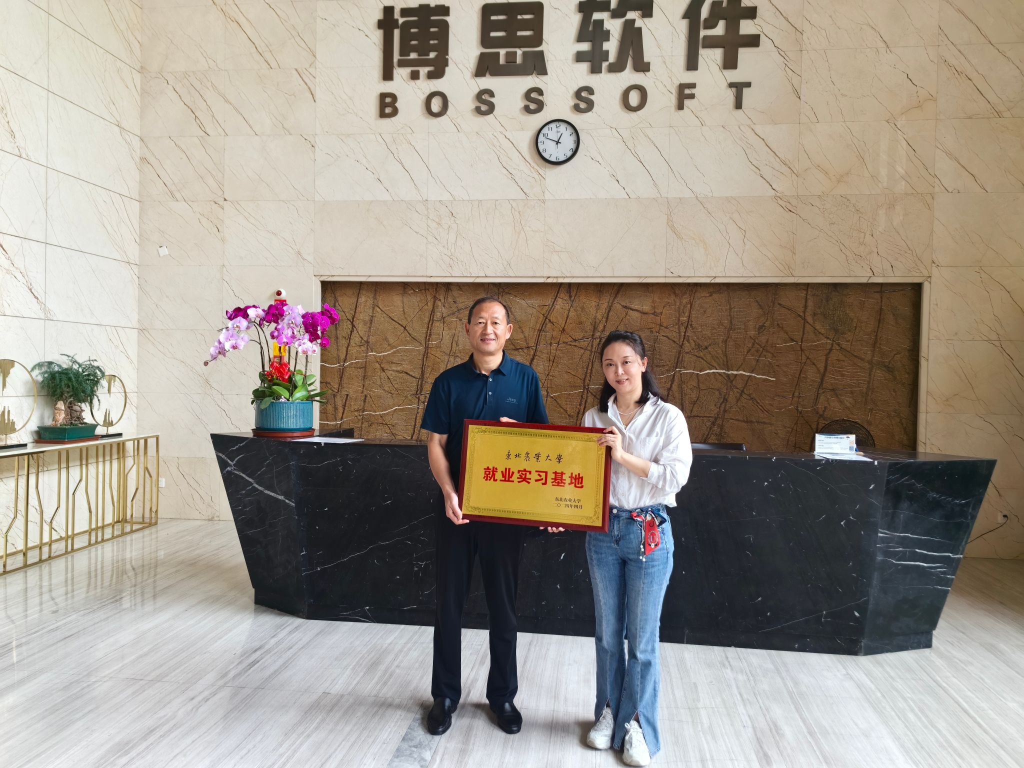 在博思软件集团一楼大厅,李伟凯代表学校向博思软件集团资深高级副总裁汪彦授予“BETVLCTOR伟德就业实习基地”牌匾。