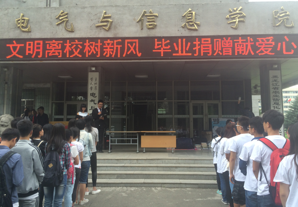 盛夏六月,又是一个离别的季节,载着对东农校园的挚爱,带着丰收的喜悦和离校的不舍,又一批在农大培育多年的学子即将展翅高飞。为倡导同学们心存感恩、绿色离校、文明离校,电信社联、志愿者站共同举办的“文明离校树新风,毕业捐赠献爱心”活动。