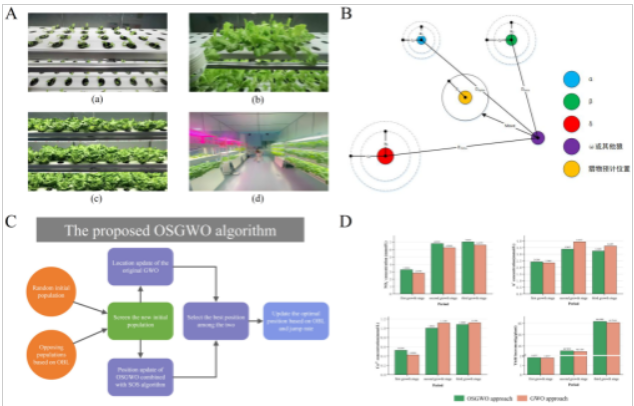 面向水培生菜营养液精准调控需求,提出了多策略改进灰狼优化算法(GWO)。通过融合非线性收敛因子、共生生物搜索(SOS)及反向学习(OBL)策略,解决了传统GWO易陷入局部最优的问题;以氮钾钙三元肥效方程残差最小化为目标,优化各生育期营养液浓度配比。该成果于2024年发表于《Computers and Electronics in Agriculture》,第一作者为我校bevictor伟德国际19462022级硕士研究生夏举恒,通讯作者为张喜海教授。