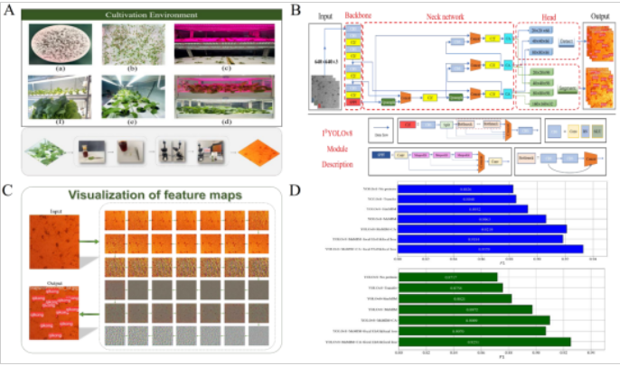 为实现油菜气孔表型的快速精准量化,创新性构建I³-YOLOv8s多任务模型。针对气孔检测中存在的稀少性、不规则性及样本不平衡三大挑战:(1)采用掩码图像重建的自监督学习预训练领域专用骨干网络;(2)在颈部网络嵌入坐标注意力机制(CA)增强多尺度特征融合;(3)设计基于Focal-EIoU的解耦损失函数优化正负样本权重分配,为作物逆境响应研究提供高效工具。该成果于2025年发表于《Expert Systems with Applications》,第一作者为我校bevictor伟德国际19462021级硕士研究生龚鑫晶(博士现就读于哈尔滨工业大学),通讯作者为张喜海教授、孟繁锋讲师。