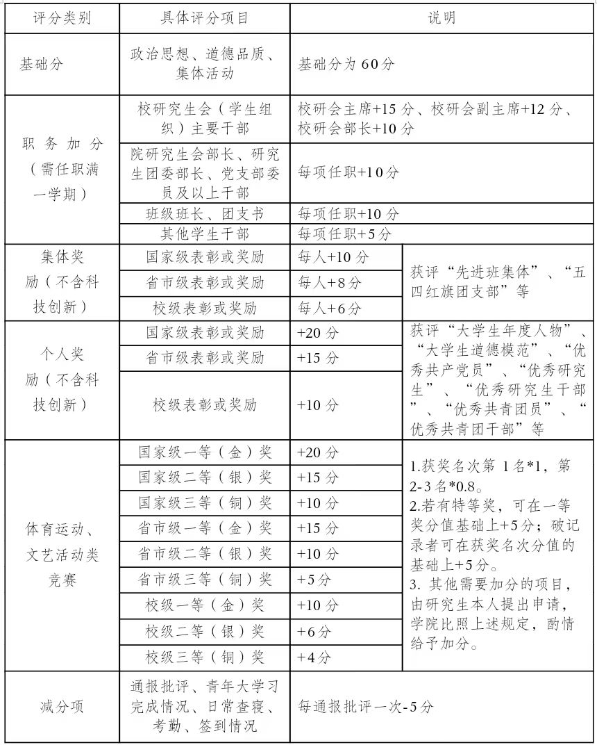 综合素质考核包括思想道德素质、社会实践参加情况,担任班级以上职务、参加文体活动等,符合申报条件的学生可获得本部分基础分60分,有以下情况的可在此基础上加分或减分,可累加。