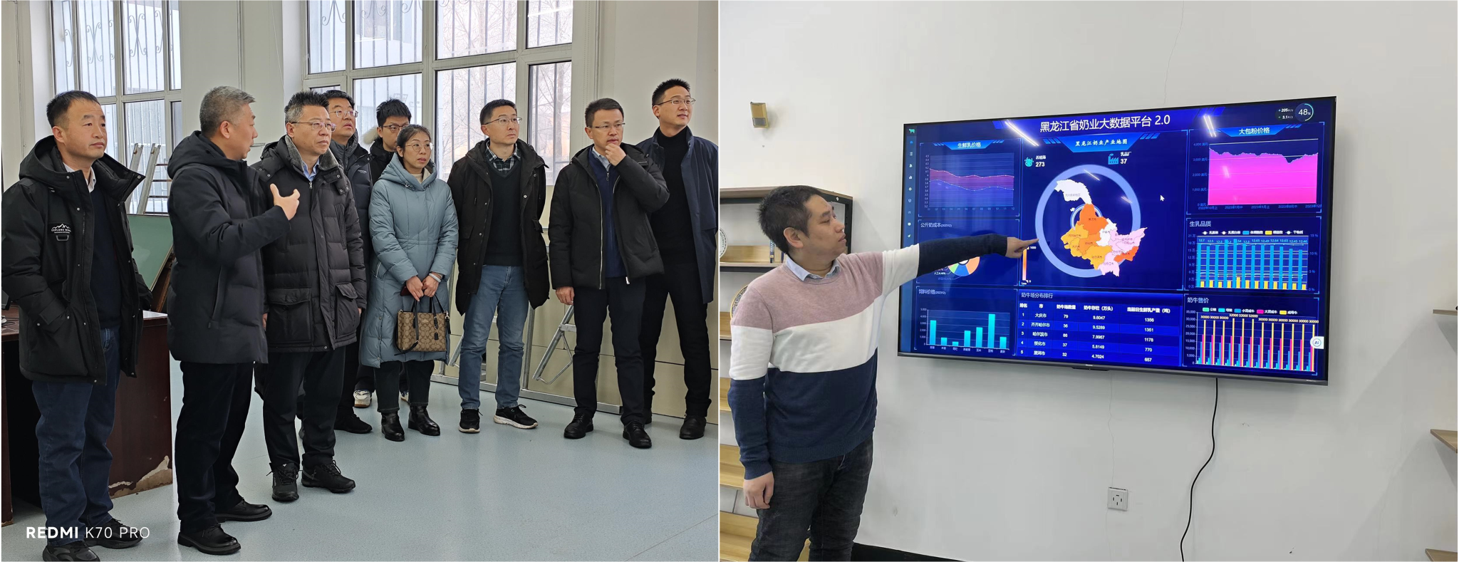 在沈维政教授团队的带领下,一行人观看了黑龙江省奶业大数据平台。该平台由BETVLCTOR伟德智慧畜牧创新团队与黑龙江省奶业协会联合开发,目前已涵盖270多家牧场和37家乳品加工企业的生产数据,包括奶牛场信息、体系牧场饲料成本统计、成母牛成本及乳品企业信息等,并可按月生成黑龙江省体系牧场经济月报、公斤奶成本、奶价对比曲线、饲料使用占比、月单产排名及年单产排名等,全方面、多维度地反映出黑龙江省奶业发展情况。当前,在黑龙江省农业农村厅畜牧处的支持下,该平台已在全省百头以上规模化牧场推广使用,对政府相关部门了解黑龙江省奶业发展情况起到了重要的支撑作用。